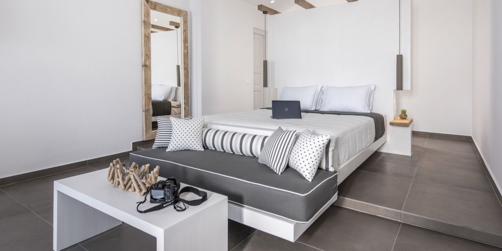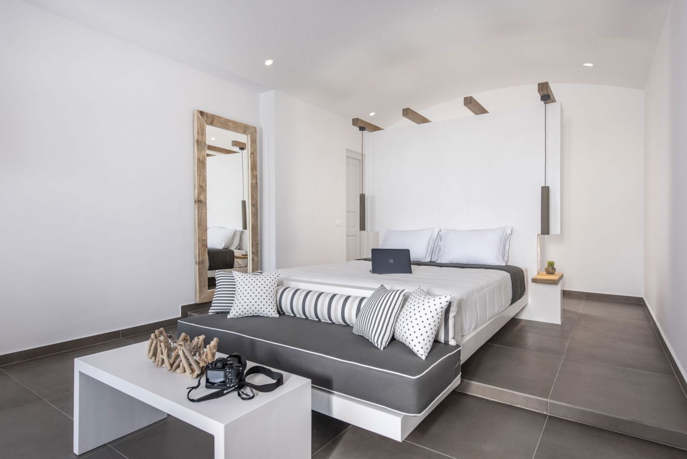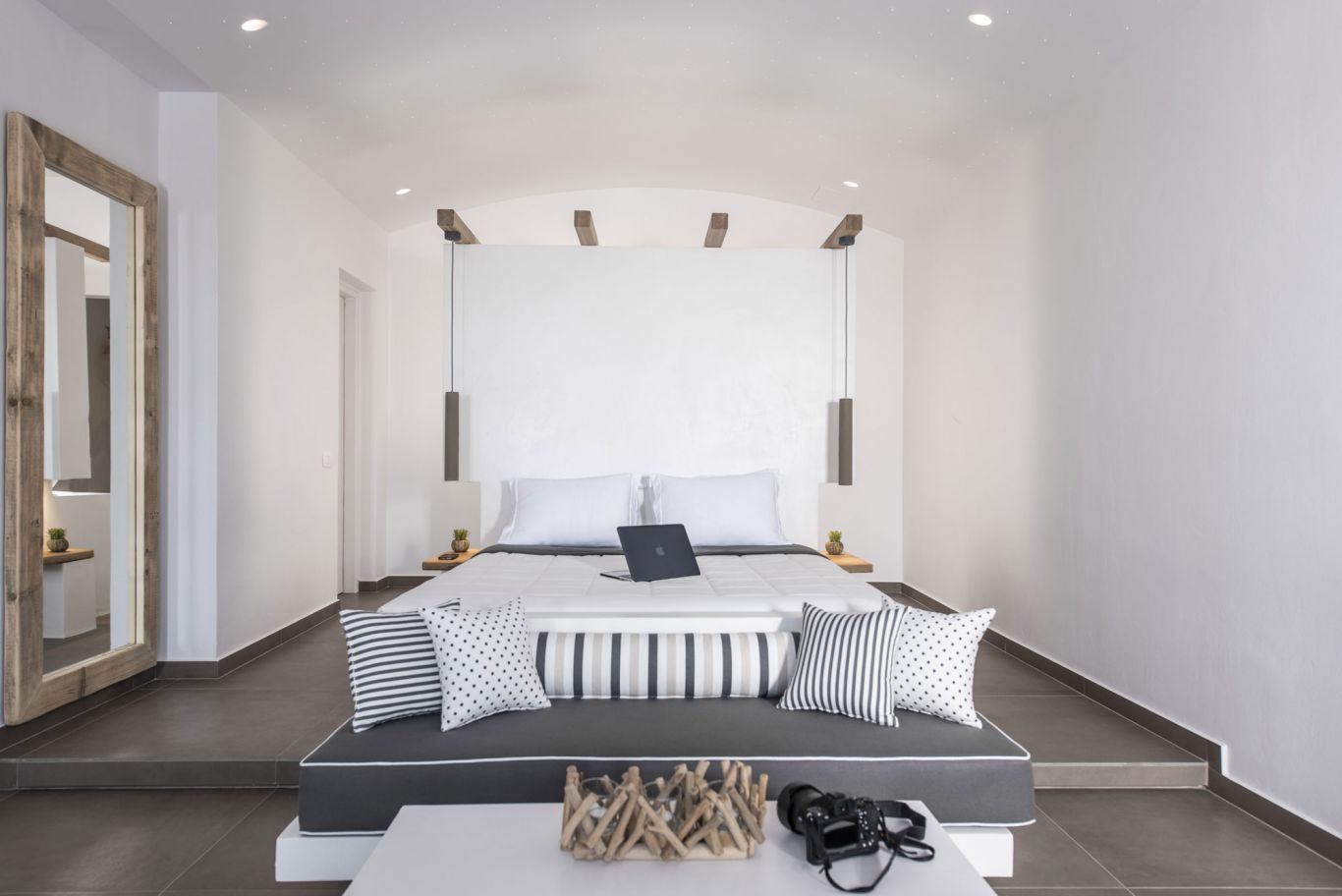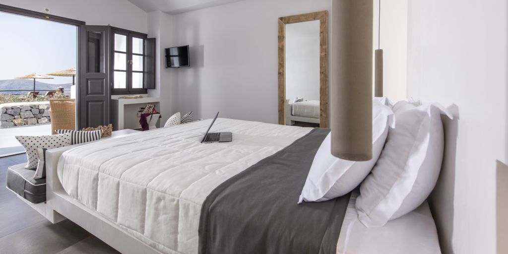 Our luxurious Grand Suite is entirely laid out on the ground floor. A soft palette of colors creates a sensational atmosphere. The spacious bedroom and open plan sitting area, the modern bathroom and the wonderful private terrace outdoors compose a magical retreat in Santorini. A place to relax, indulge in luxury and enjoy!