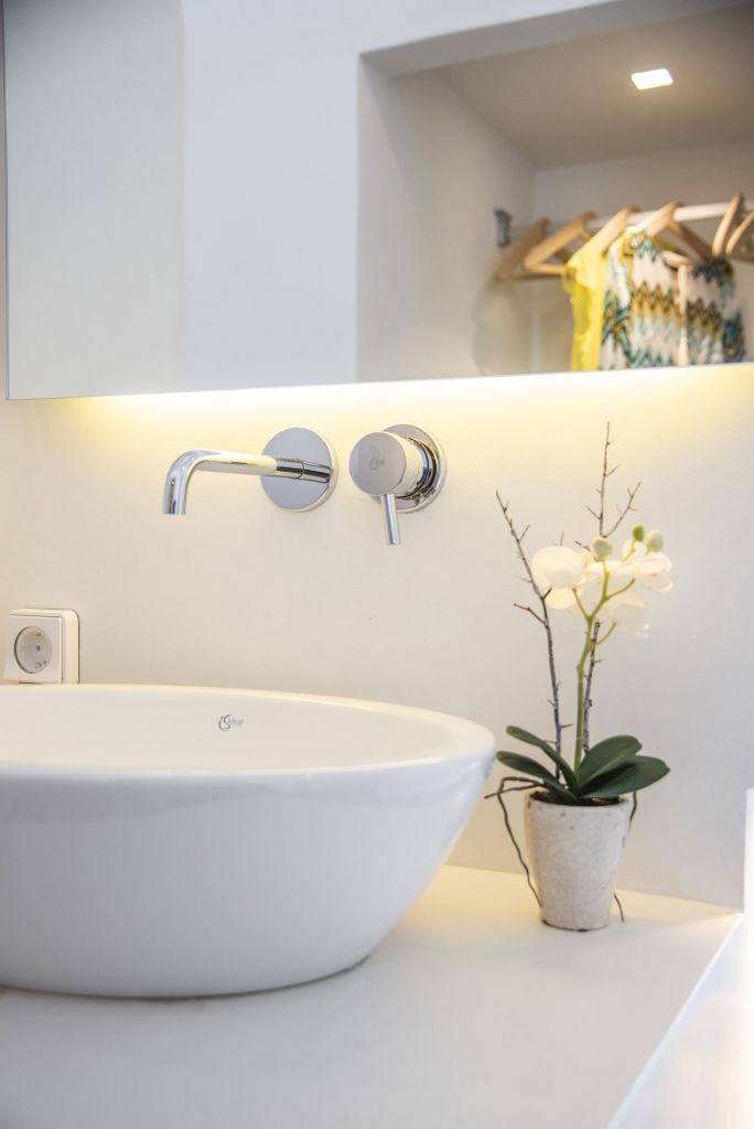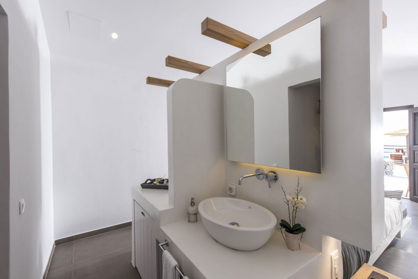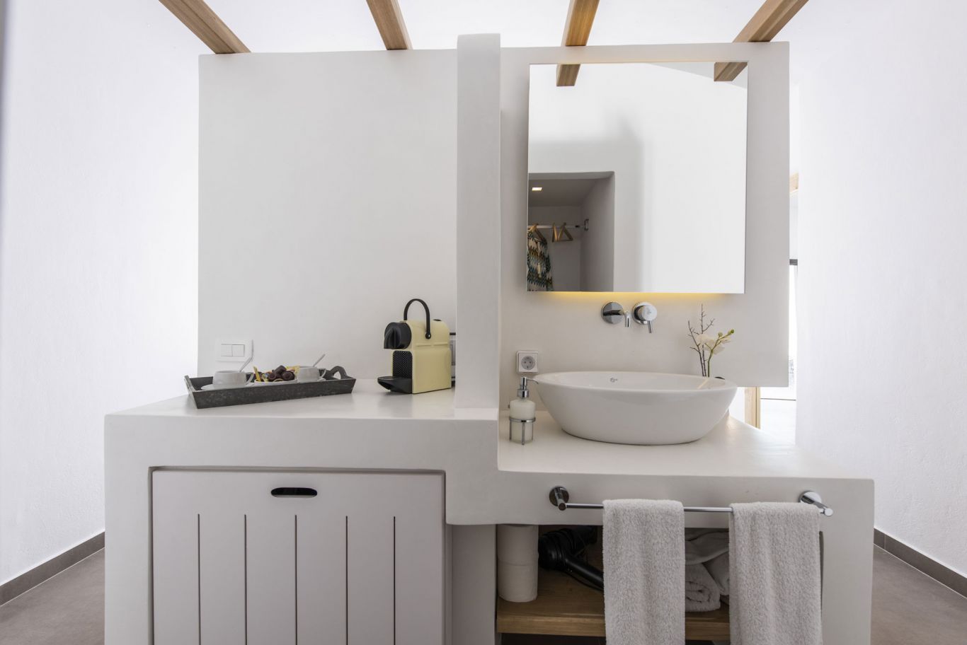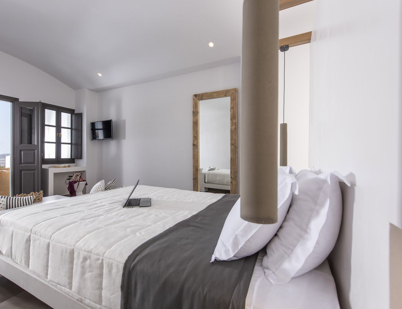 Our luxurious Grand Suite is entirely laid out on the ground floor. A soft palette of colors creates a sensational atmosphere. The spacious bedroom and open plan sitting area, the modern bathroom and the wonderful private terrace outdoors compose a magical retreat in Santorini. A place to relax, indulge in luxury and enjoy!